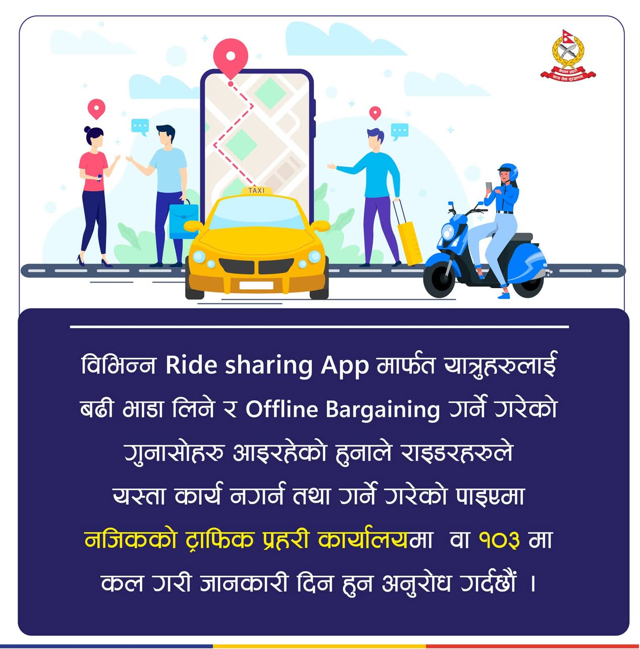 “कृपया एपमा देखिएको भाडा बमोजिम मात्र लिइयोस्। एपबाहिर बार्गेनिङ नगर्नुहोस्। यदि यस्तो कार्य गरेको भेटिएमा आवश्यक कारबाही गरिनेछ।”